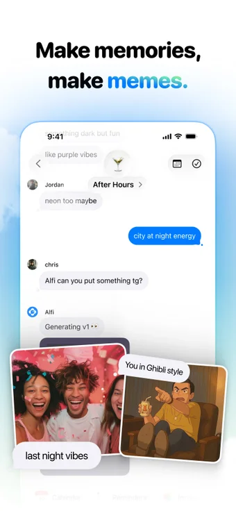 Alfi: Your Group Chat makes group conversations fun and productive. It helps plan events, suggest restaurants, generate creative content, and track group activity through features such as Reminders, Memories, and Group Wrapped. Advanced AI features offer powerful tools but take time to master.